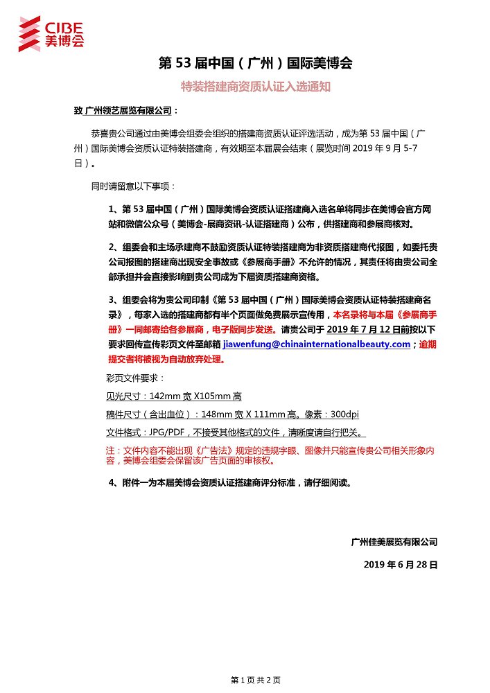 近日,廣州領(lǐng)藝展覽經(jīng)過激烈角逐,在全國會(huì)展公司中脫穎而出,喜獲53屆中國(廣州)美博會(huì)認(rèn)證特裝搭建資質(zhì)證書。領(lǐng)藝展覽是專業(yè)的展臺(tái)設(shè)計(jì)搭建公司,擁有豐富的展臺(tái)設(shè)計(jì)、搭建、運(yùn)營及維護(hù)經(jīng)驗(yàn),專注布展15年經(jīng)驗(yàn)。至今已經(jīng)服務(wù)超過千家企業(yè),致力于成為參展企業(yè)有價(jià)值的合作伙伴和有競爭力的品牌服務(wù)商;已經(jīng)成為參加美博會(huì)美博會(huì)的參展企業(yè)首選展臺(tái)設(shè)計(jì)搭建商,歡迎新老客戶前來咨詢洽談。咨詢電話:13711456636 微信同號(hào)。更多詳情請(qǐng)瀏覽我司官方網(wǎng)站:www.583233.com