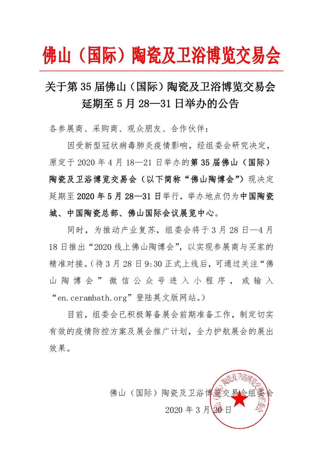 根據陶博會陶瓷展設計搭建公司領藝展覽了解到,受新型冠狀病毒疫情防控影響。為全力做好新型冠狀病毒感染肺炎疫情防控工作,為了響應及配合疫情防控工作,確保各參展商及觀眾的健康安全,陶博會組委會決定將原定于2020年4月18-21日舉辦的第35屆佛山(國際)陶瓷及衛(wèi)浴博覽交易會將延期至5月28—31日舉辦。如需陶博會設計請聯(lián)系領藝展覽,希望我們能在陶博會搭建上為您添磚加瓦,祝各位朋友收獲多多,滿載而歸!