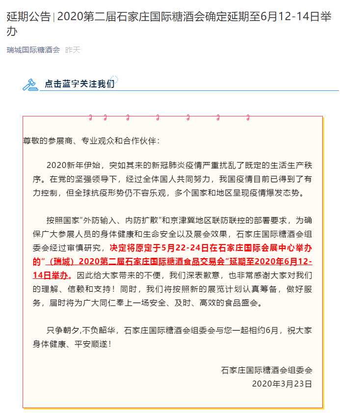 根據(jù)糖酒會(huì)設(shè)計(jì)搭建公司領(lǐng)藝展覽了解到,原定于5月22-24日在石家莊國(guó)際會(huì)展中心舉辦的“(瑞城)2020第二屆石家莊國(guó)際糖酒食品交易會(huì)”延期至2020年6月12-14日舉辦。如需糖酒會(huì)設(shè)計(jì)請(qǐng)聯(lián)系領(lǐng)藝展覽,希望我們能在糖酒會(huì)搭建上為您添磚加瓦,祝各位朋友收獲多多,滿載而歸!