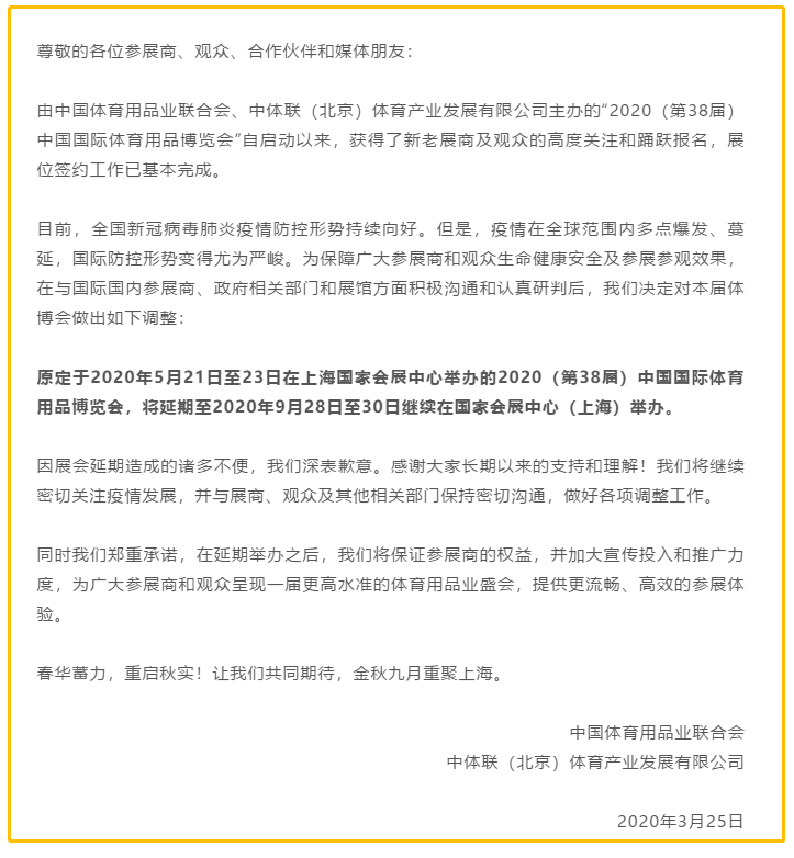 根據(jù)體博會(huì)設(shè)計(jì)搭建公司領(lǐng)藝展覽了解到,原定于2020年5月21日至23日在上海國(guó)家會(huì)展中心舉辦的2020(第38屆)中國(guó)國(guó)際體育用品博覽會(huì),將延期至2020年9月28日至30日繼續(xù)在國(guó)家會(huì)展中心(上海)舉辦。如需體博會(huì)設(shè)計(jì)請(qǐng)聯(lián)系領(lǐng)藝展覽,希望我們能在體博會(huì)搭建上為您添磚加瓦,祝各位朋友收獲多多,滿載而歸!