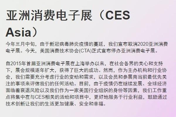 今年三月,由于新冠病毒肺炎疫情,主辦方宣布取消2020亞洲消費電子展。如今,美國消費技術(shù)協(xié)會(CTA)正式宣布停辦亞洲消費電子展。