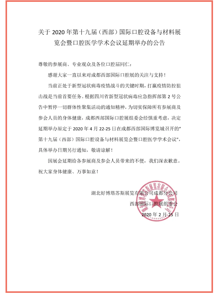 根據(jù)成都西部國際口腔展設(shè)計(jì)搭建公司領(lǐng)藝展覽了解到,當(dāng)前正處于新型冠狀病毒疫情戰(zhàn)斗的關(guān)鍵時(shí)期,打贏疫情防控狙擊戰(zhàn)是當(dāng)前首要任務(wù)。根據(jù)四川省新型冠狀病毒應(yīng)急指揮部第2號(hào)公告中暫停一切群體性聚集活動(dòng)的通知精神,為保障所有參展商及參會(huì)人員的安全和健康,成都西部國際口腔展組委會(huì)經(jīng)慎重考慮,決定延期舉辦原定于2020年4月22-25日在成都西部國際博覽城召開的“第十九屆(西部)國際口腔設(shè)備與材料展覽會(huì)暨口腔醫(yī)學(xué)學(xué)術(shù)會(huì)議”,具體舉辦日期另行通知,敬請諒解!如需成都口腔展設(shè)計(jì)請聯(lián)系領(lǐng)藝展覽,希望我們能在口腔展搭建上為您添磚加瓦,祝各位朋友收獲多多,滿載而歸!