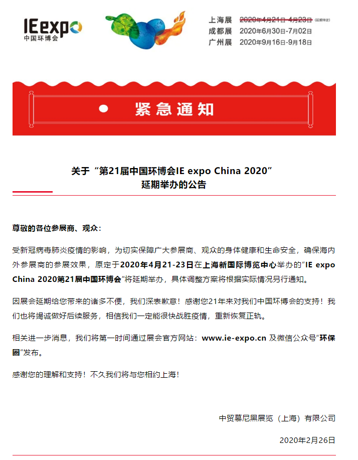 根據(jù)環(huán)博會設(shè)計搭建公司領(lǐng)藝展覽了解到,受新冠病毒肺炎疫情的影響,為切實保障廣大參展商、觀眾的身體健康和生命安全,確保海內(nèi)外參展商的參展效果,原定于2020年4月21-23日在上海新國際博覽中心舉辦的“IE expo China 2020第21屆中國環(huán)博會”將延期舉辦,具體調(diào)整方案將根據(jù)實際情況另行通知。相信我們一定能很快戰(zhàn)勝疫情,重新恢復(fù)正軌。相關(guān)進一步消息,主辦將第一時間通過展會官方網(wǎng)站:www.ie-expo.cn 及微信公眾號“環(huán)保圈”發(fā)布。如需環(huán)博會設(shè)計請聯(lián)系領(lǐng)藝展覽,希望我們能在環(huán)博會搭建上為您添磚加瓦,祝各位朋友收獲多多,滿載而歸!