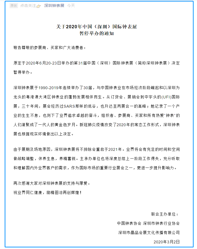 根據(jù)深圳展臺(tái)設(shè)計(jì)搭建公司領(lǐng)藝展覽了解到,原定于2020年6月20-23日舉辦的第31屆中國(深圳)國際鐘表展(簡稱深圳鐘表展)決定暫停舉辦。如需深圳展臺(tái)設(shè)計(jì)請(qǐng)聯(lián)系領(lǐng)藝展覽,希望我們能在深圳展會(huì)搭建上為您添磚加瓦,祝各位朋友收獲多多,滿載而歸!
