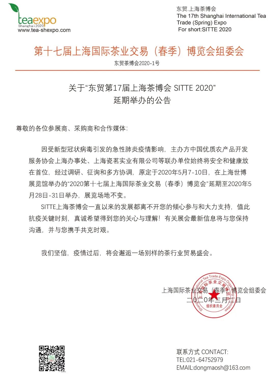 根據(jù)上海春季茶博會設(shè)計搭建公司領(lǐng)藝展覽了解到,因受新型冠狀病毒肺炎疫情的影響,原定于2020年5月7-10日,在上海世博展覽館舉辦的“2020第十七屆上海國際茶業(yè)交易(春季)博覽會”延期至2020年5月28-31日舉辦,展覽場地不變。如需上海茶博會設(shè)計請聯(lián)系領(lǐng)藝展覽,希望我們能在上海茶博會搭建上為您添磚加瓦,祝各位朋友收獲多多,滿載而歸!
