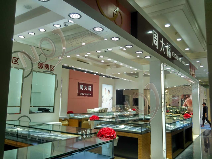 契合周大福的品牌形象和產(chǎn)品特性,采用矩形結(jié)構(gòu),再搭配燈具燈光的效果,襯托出展位高端、時(shí)尚的氛圍,突出一種現(xiàn)代、歐美的時(shí)尚品味。