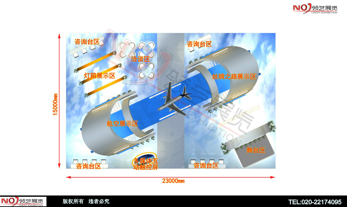 由航空飛機模型為創(chuàng)意主體,結(jié)構(gòu)采用弧形結(jié)構(gòu),展現(xiàn)海上絲綢之路國家的航空鏈接再搭配采用聲光電,襯托出展位大氣、豪華的氛圍,突出一種簡約、時尚現(xiàn)代感十足的國際化效果。